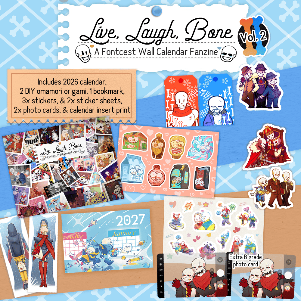 Live, Laugh, Bone: Volume 2 is a 2026 Papysans / Sanspapy wall calendar created by 20 artists. It includes 48+ illustrations of Papysans / Sanspapy (AU-friendly).